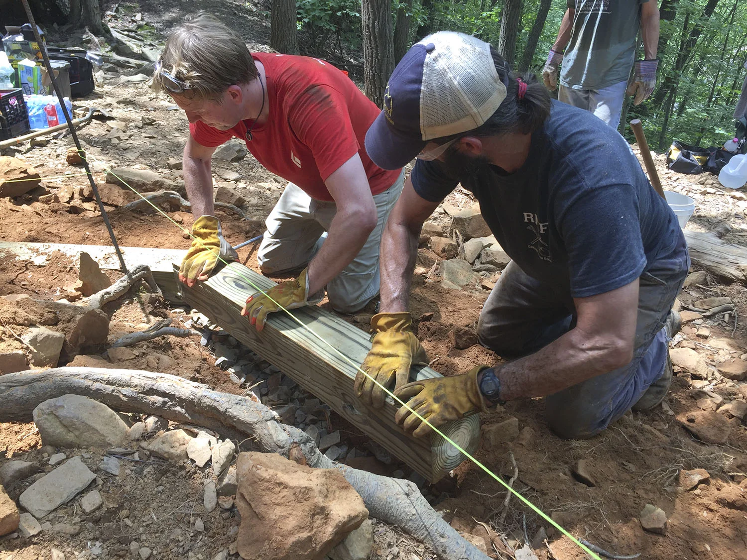 More than 15 RCF staff and volunteers from CT-AMC and the RMF Conservation Crew assembled to clean up trash, graffiti and construct a pressure treated lumber retaining wall at the base of Pinnacle Rock's Cracked Wall. The new wall extends more than 30 feet from the base of Entertainer to just left of Second Crack, rising about 3.5 feet at its highest point.