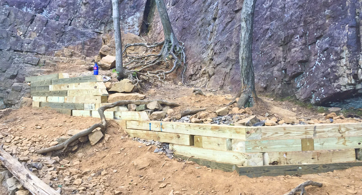 This is the first step in a project to harden the base at Pinnacle Rock. Future plans include building a second retaining wall below the Cracked Wall and relocating a portion of the south-end trail to a more durable location.