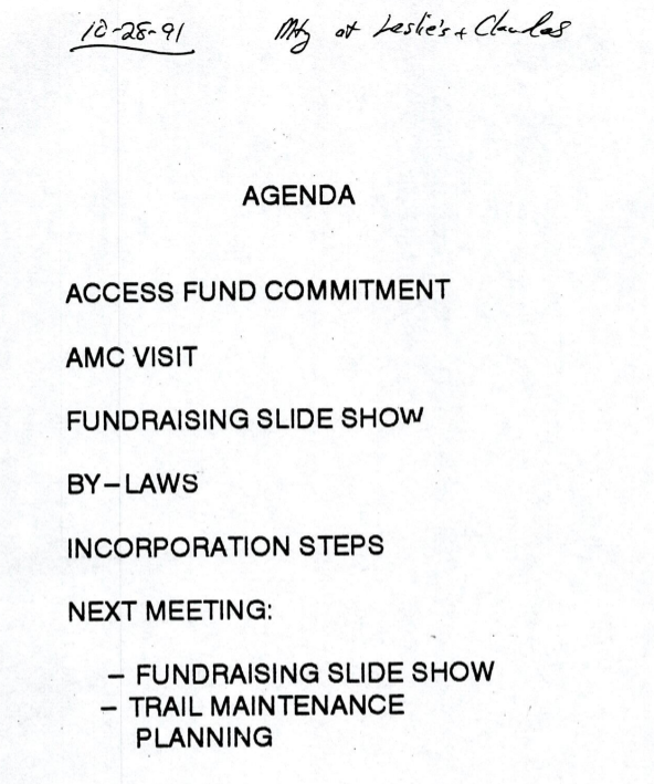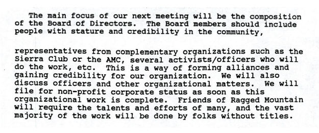 RMF Archives, excerpts from Friends of Ragged Mountain Meeting Minutes and first official meeting agenda, October 1991.