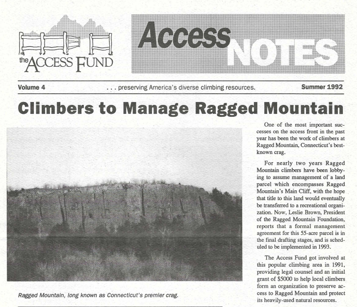 An excerpt from an article published by the Access Fund in Summer of 1992, celebrating the planned acquisition of Ragged Mountain by the Ragged Mountain Foundation.