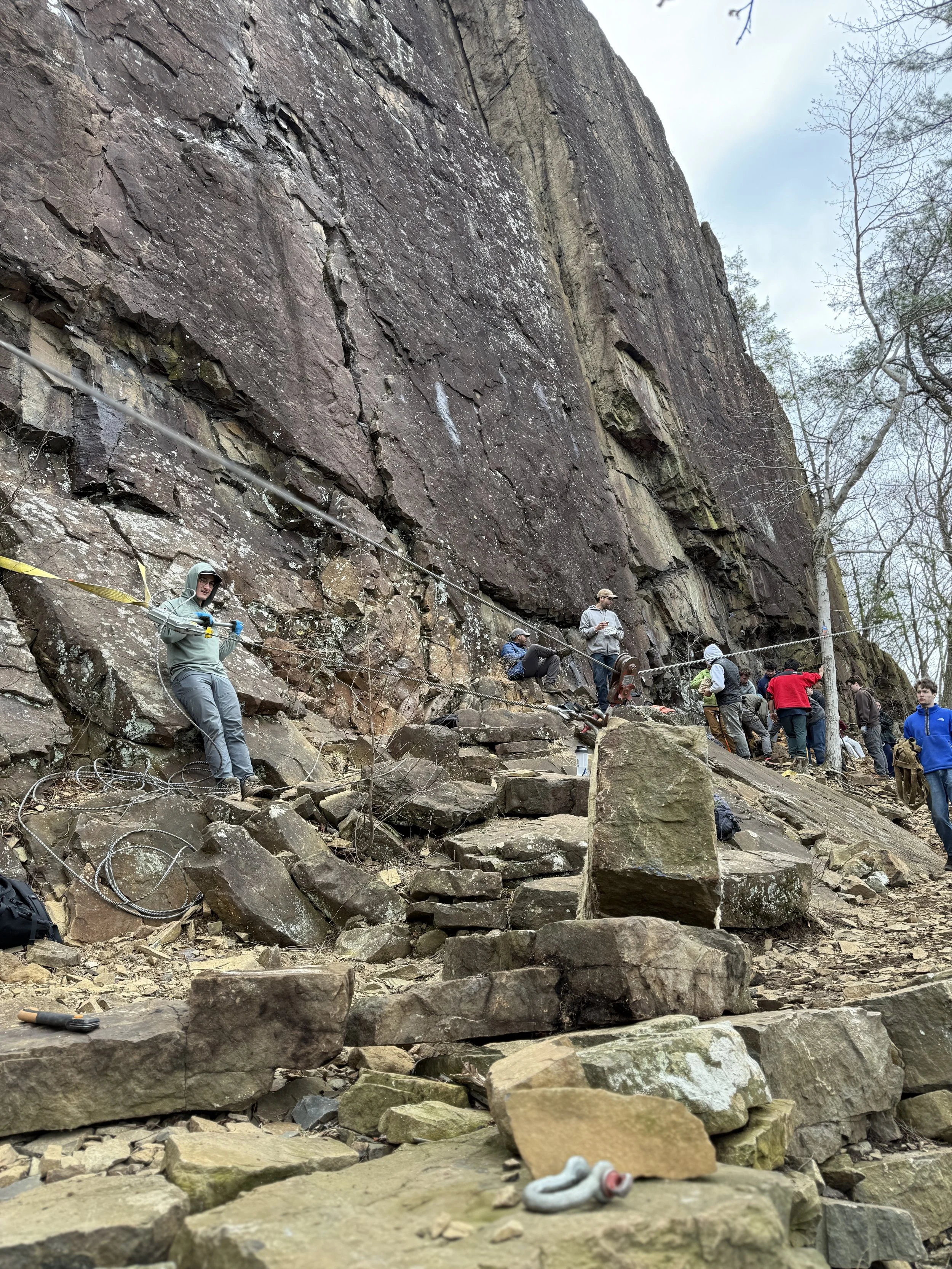 The goal was to start building a retaining wall underneath the popular south end climbs from Carey Corner to Green Gutter. A few years ago the dead Hemlock trees were removed as they presented clear and obvious hazards. The RMF’s attempt to save the trees only slowed the process. Now that the dead hemlocks root balls are decaying, the hill side close to the cliff between Carey Corner and Green Gutter have slowly begun to erode. Due to the erosion around the hemlock stumps, the loose dirt and scree have made it harder to access the base of several classic Ragged routes. The ongoing efforts will, hopefully, create a solid belay stance at the base of these climbs, prevent further erosion and save what trees are left in this zone.